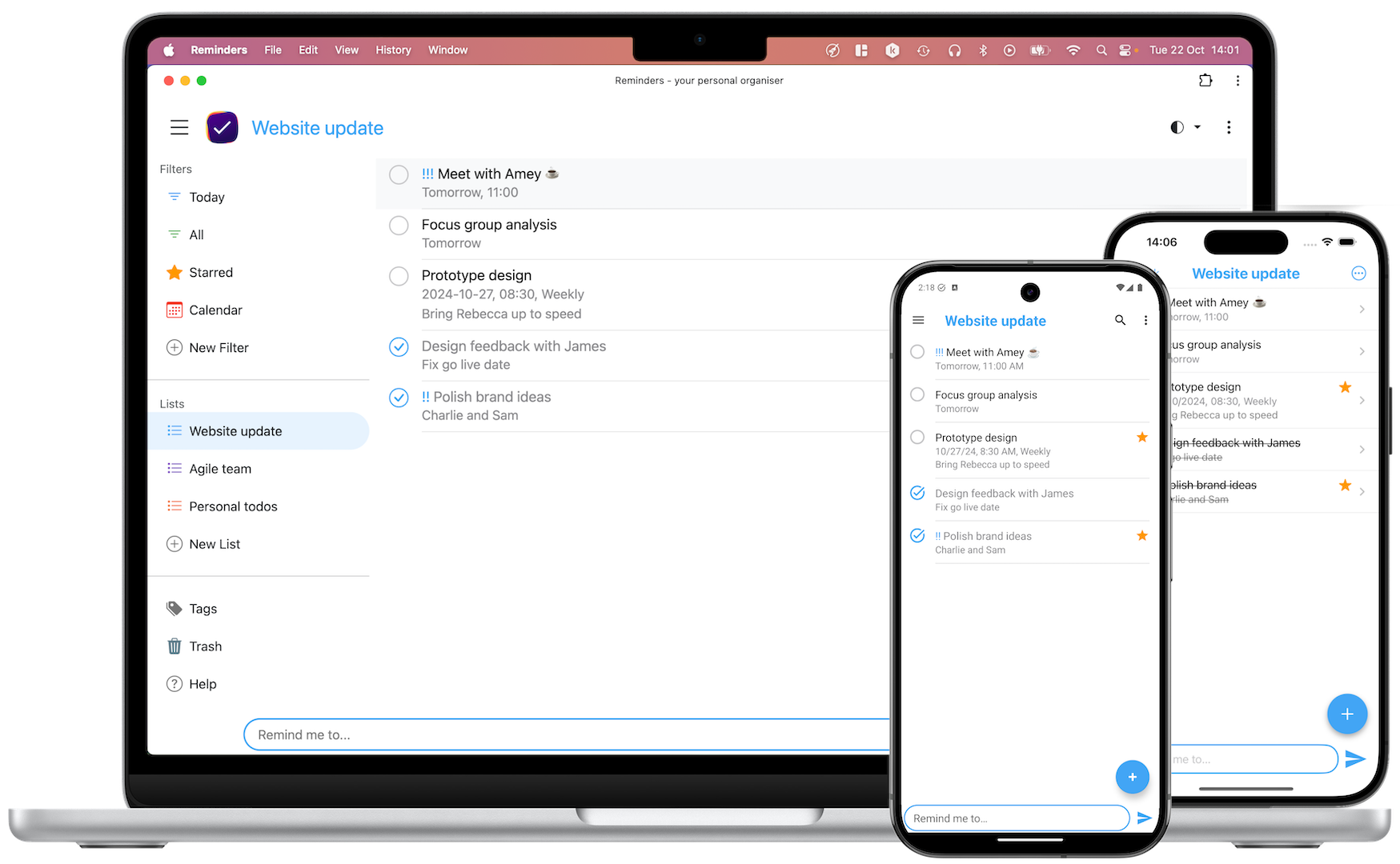 With Reminders app in your pocket, you can create lists effortlessly. Add alerts, priorities and flag the most important items. With the build in filters you can see what is most important and get things done.